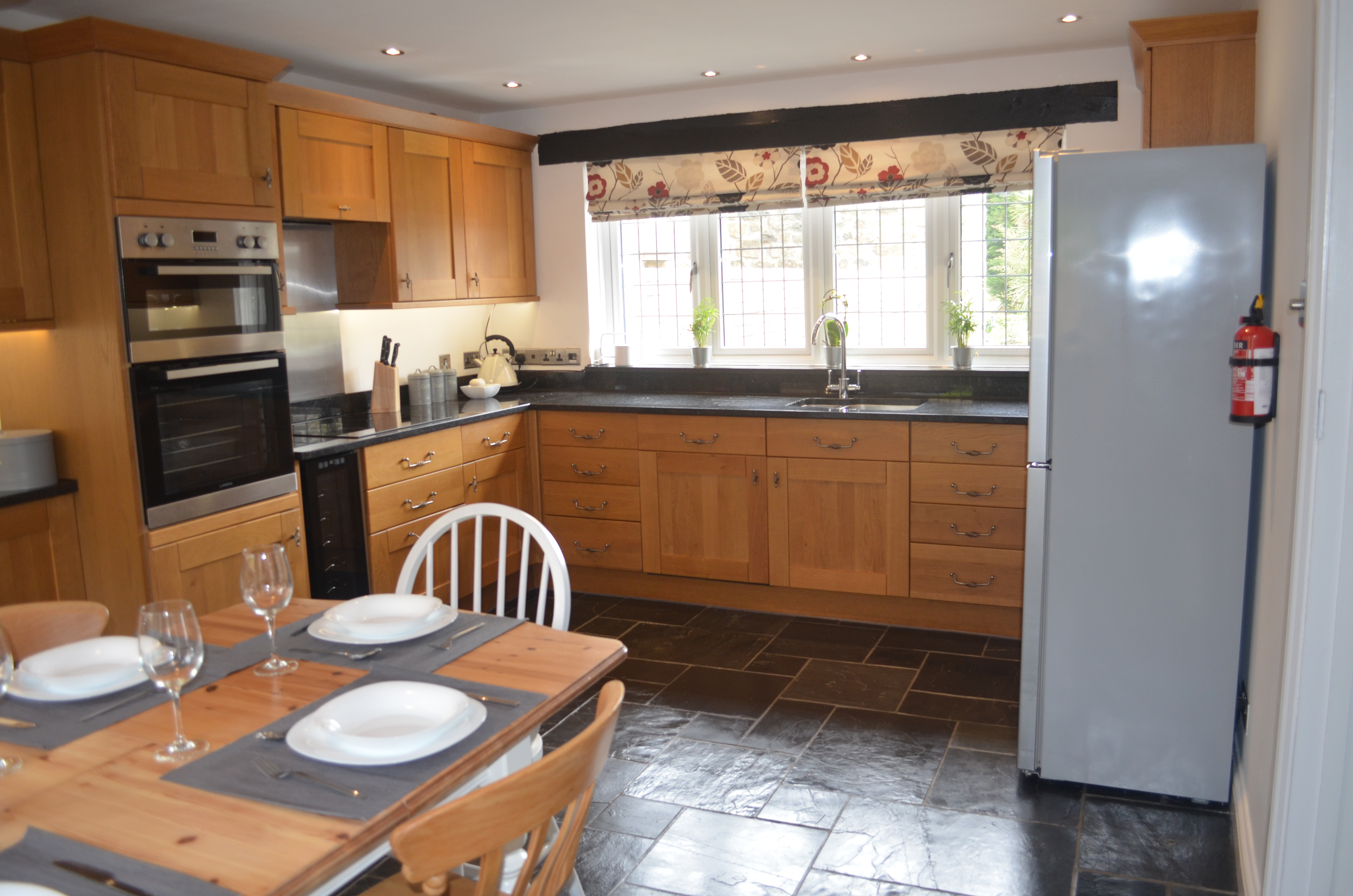 The kitchen is very well equipped with oven, hob, fridge freezer, wine cooler, microwave, toaster and coffee machine to enjoy home cooked meals. The kitchen table extends to seat up to 6, with additional seating in the lounge with another table and chairs.